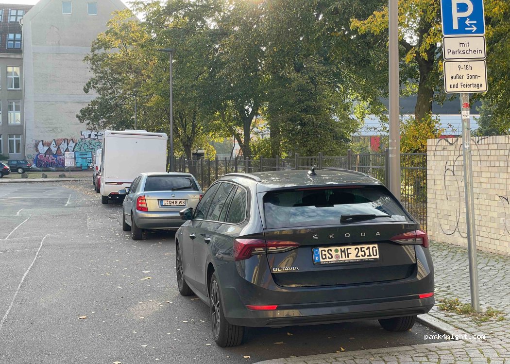 Aparcamiento disponible en el centro de la ciudad de Leipzig. Un terreno un poco irregular, pero completamente suficiente para la única noche que estuvimos aquí. Relativamente tranquilo, ya que al lado se encuentra la universidad y un polideportivo.