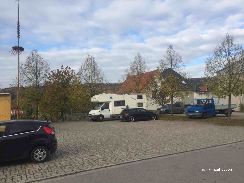 Small, illuminated parking lot opposite the church. Be careful, it's hidden behind a hedge. Cool spot.