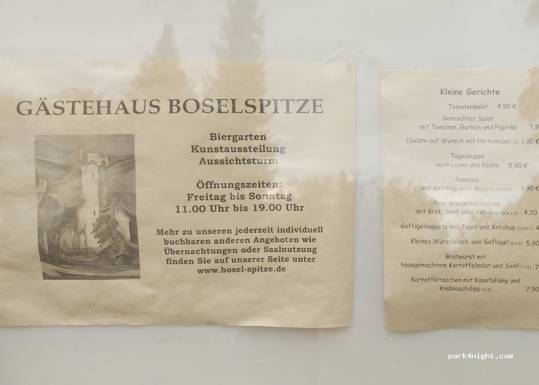 Bonito aparcamiento tranquilo en una calle sin salida. Simplemente siga la calle "Boselweg" hasta la casa de huéspedes "Boselspitze". También tienen una gran taberna al aire libre.