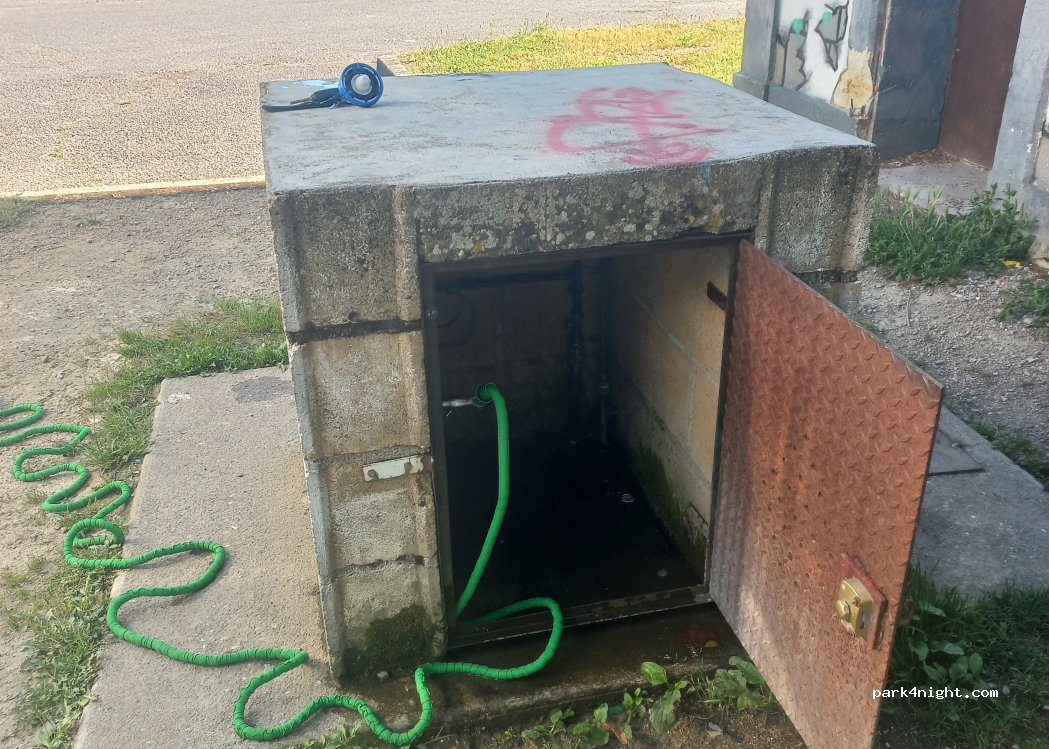 Je confirme, aire de service gratuite, vidange eaux grises et toilettes. Pas vu de remplissage. Quelques places sans doute un peu bruyantes.