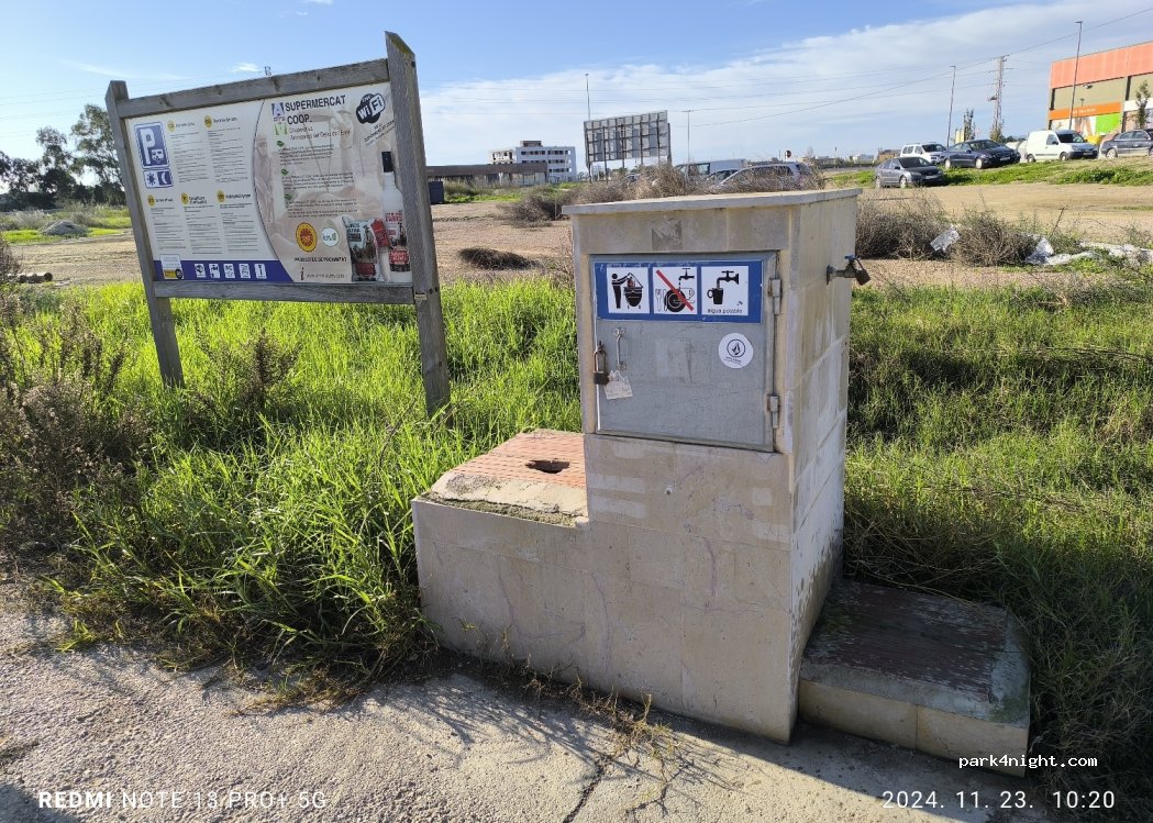 There is a large parking lot for campers, there is a dirty water and sewage discharge and there is a water tap. next to it there is an unmanned gas station and several specialist shops.