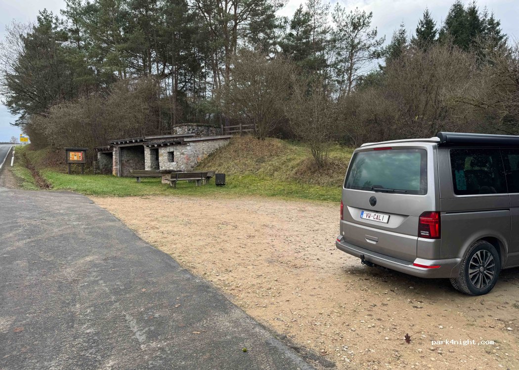 Kleiner Parkplatz am Straßenrand. Picknickbank vorhanden.