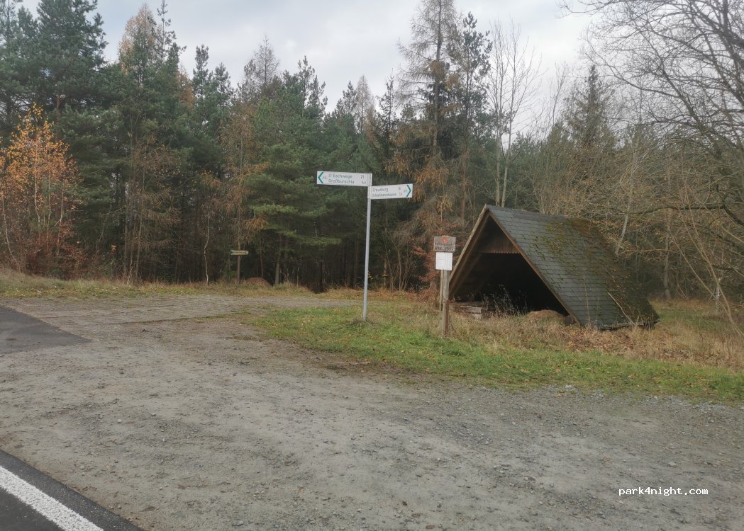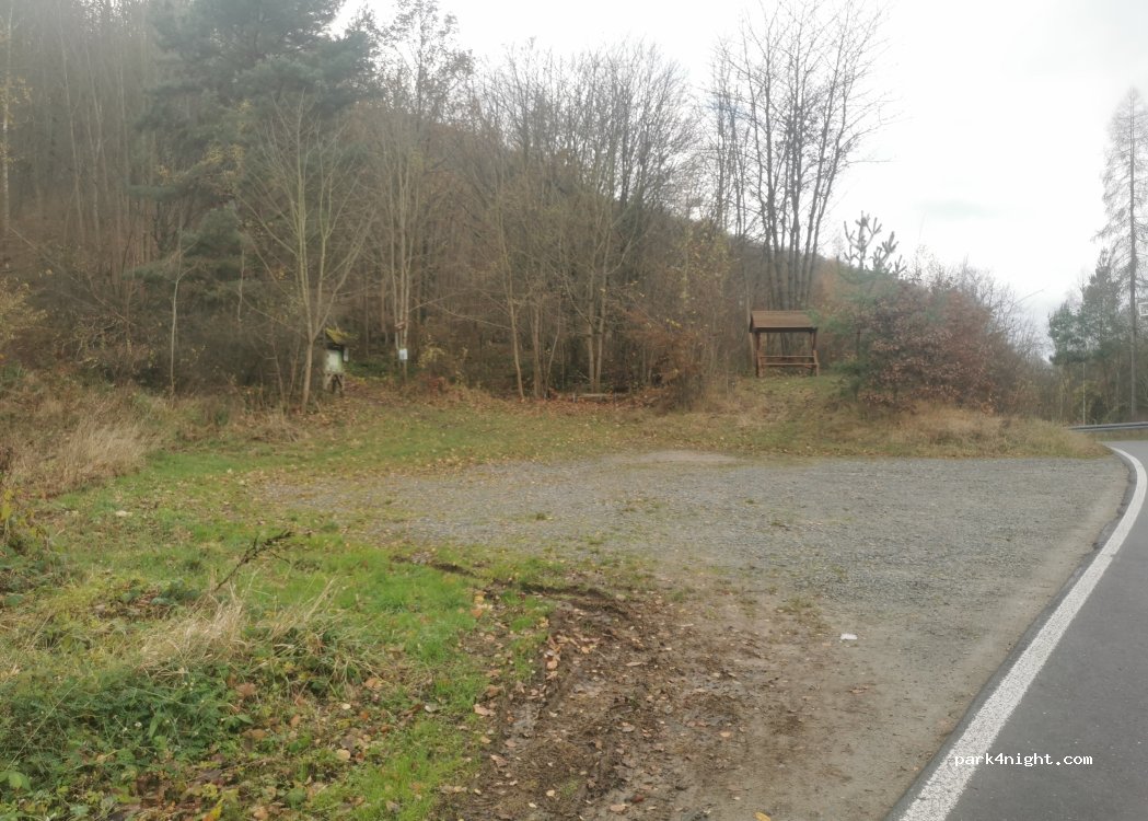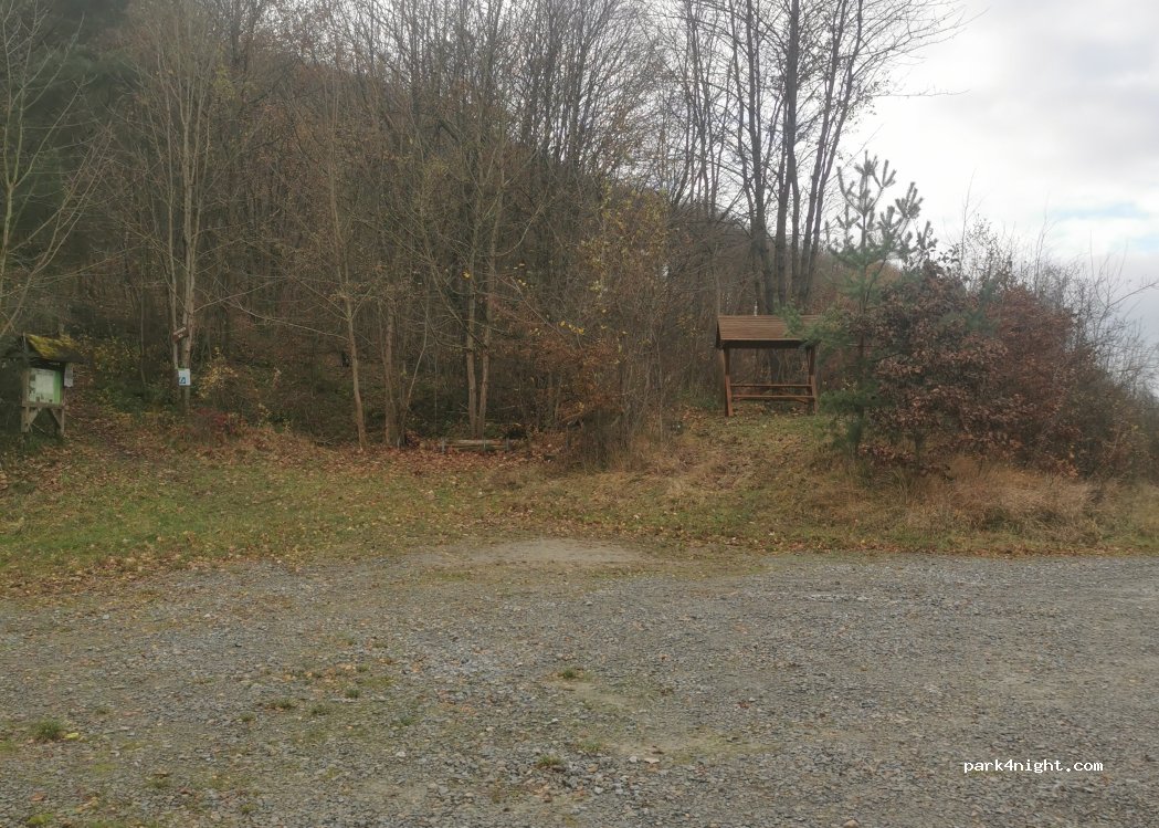 Parking at the entrance to Heldrastein, covered seats and hiking and cycling trails.
