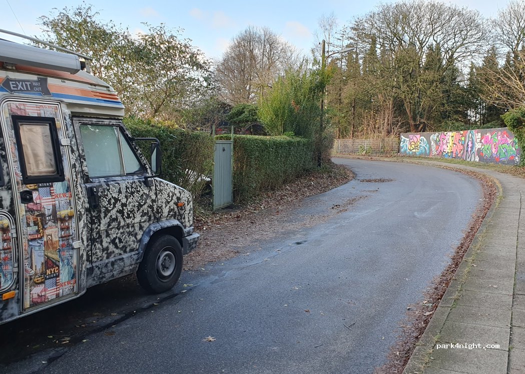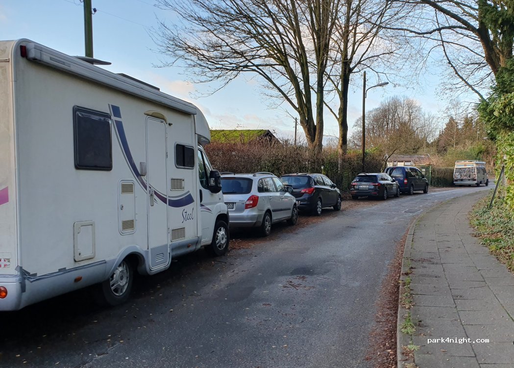 Sehr ruhige Nebenstraße zwischen Kleingartenverein und Friedhof. Hier bekommt man immer einen Stellplatz und hat seine Ruhe. Die Strasse ist für 7.49t gesperrt.