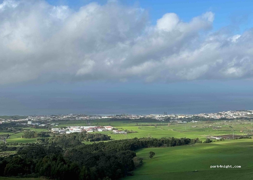 Parking lot of the Caldeira Velha hot springs. The hot springs are open from 9-5, and the parking lot is quiet after that. Beautiful views over the nearby cow farm and ocean. No services available - but definitely worth a visit to the hot springs!