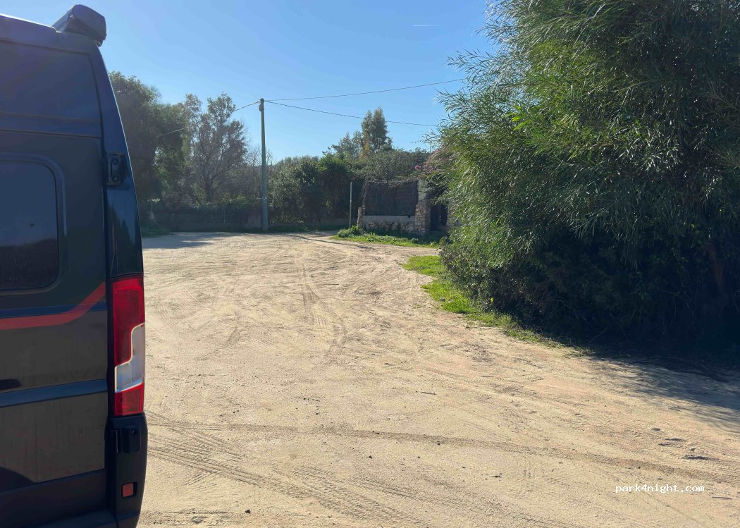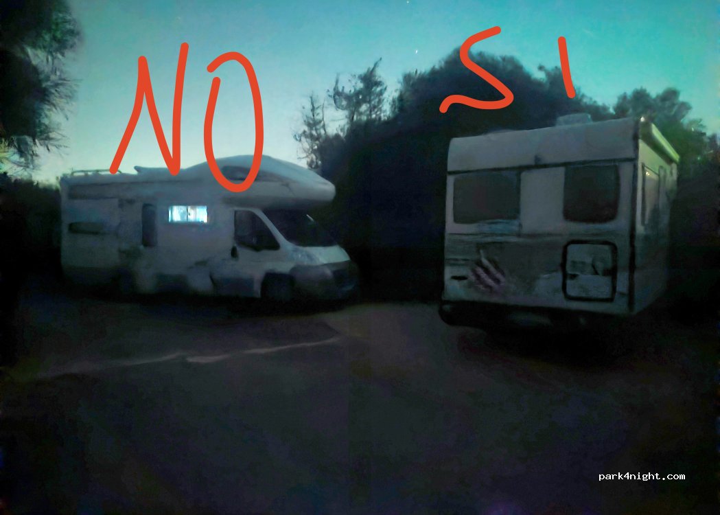 Private parking area, kindly offered by the neighboring community. Suitable for campers up to 6.5 m (only 2 spaces) or under 6 m (3 additional spaces), as the parking spaces, although unmarked, are herringbone-shaped. The neighboring community, although very kind and tolerant, provides parking for everyone. If you start taking advantage of it and with a 7-meter vehicle you take up four parking spaces, they will not allow anyone else to enter.