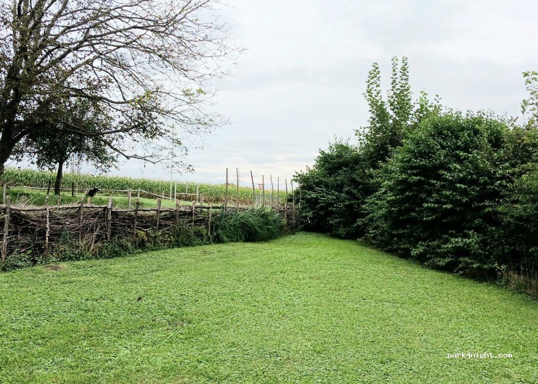 Parcela pavimentada en un entorno rural tranquilo cerca de una antigua granja, con ducha y aseo. Ideal para hacer una parada o relajarse, practicar ciclismo y senderismo.