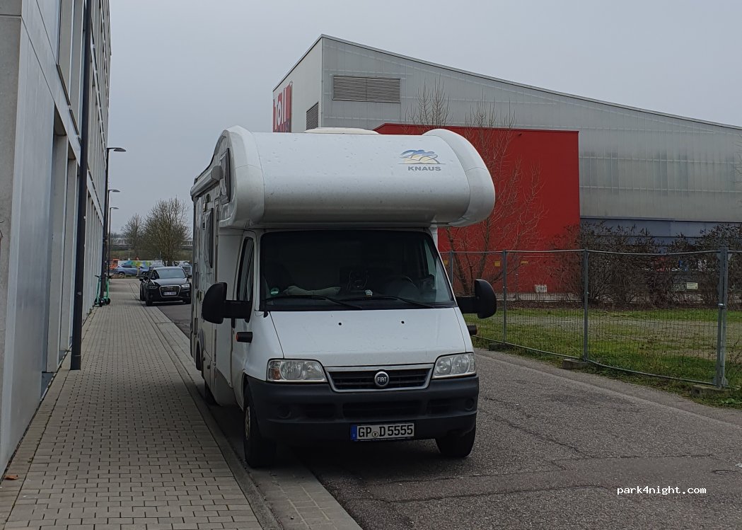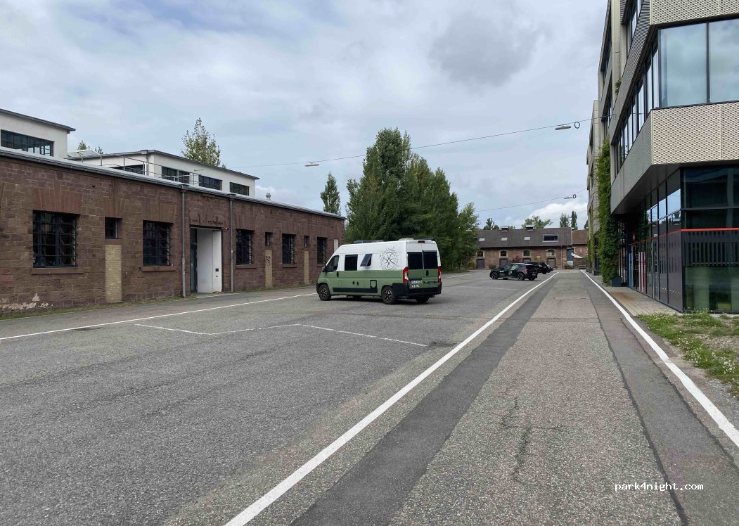 Wir standen hier, nicht an der Straße, sondern in einer der 2 großen Parkharfen am alten Schlachthof, um ein Konzert im „Tollhaus“ zu besuchen. Am Wochenende ist das kostenlos und erlaubt! Absolut ruhige Nacht, und sehr eben. Keine 2 Gehminuten zum Tollhaus! Toll :-))