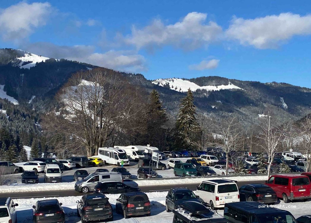 Großer ebener Parkplatz, auf dem PKW und Wohnmobile parken. Tagsüber noch kostenfrei. Übernachtungsgebühr für Wohnmobile 10€. Tickets gibt es bei der Liftstation. Am hinteren Rand des Platzes hört man die Straße kaum.