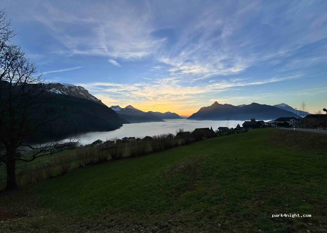 Wir waren begeistert von der Lage: Sonnenuntergang mit Aussicht auf den Vierwaldstättersee. Die Straße und der drehende Linienbus haben uns nicht weiter gestört. Für nen Zwischenstopp top! Preis angemessen. Dafür auch legal. Die freundliche Nachbarin wechselte Geld und half uns mit ner Flasche Wein aus - sicher ein Ausnahmefall, Dankeschön dafür!