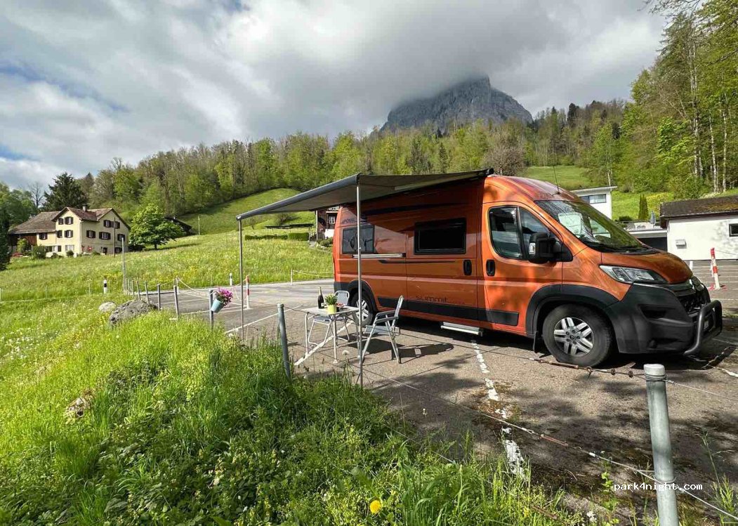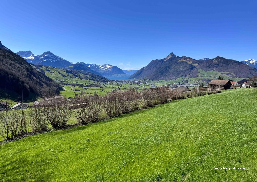 Notre parking se situe sur une propriété privée offrant une vue imprenable sur le lac des Quatre-Cantons et les montagnes. La surface goudronnée est légèrement en pente (des cales de mise à niveau sont recommandées) et convient aux camping-cars autonomes jusqu'à 3,5 tonnes (pas de sanitaires sur place).