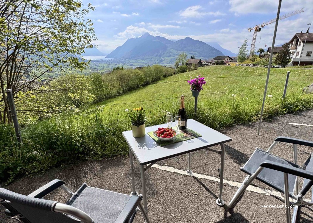 Our parking area is located on private property with views of Lake Lucerne and the mountains. The paved area has a slight slope (leveling ramps recommended) and is suitable for self-sufficient motorhomes up to 3.5 tons (no on-site facilities).