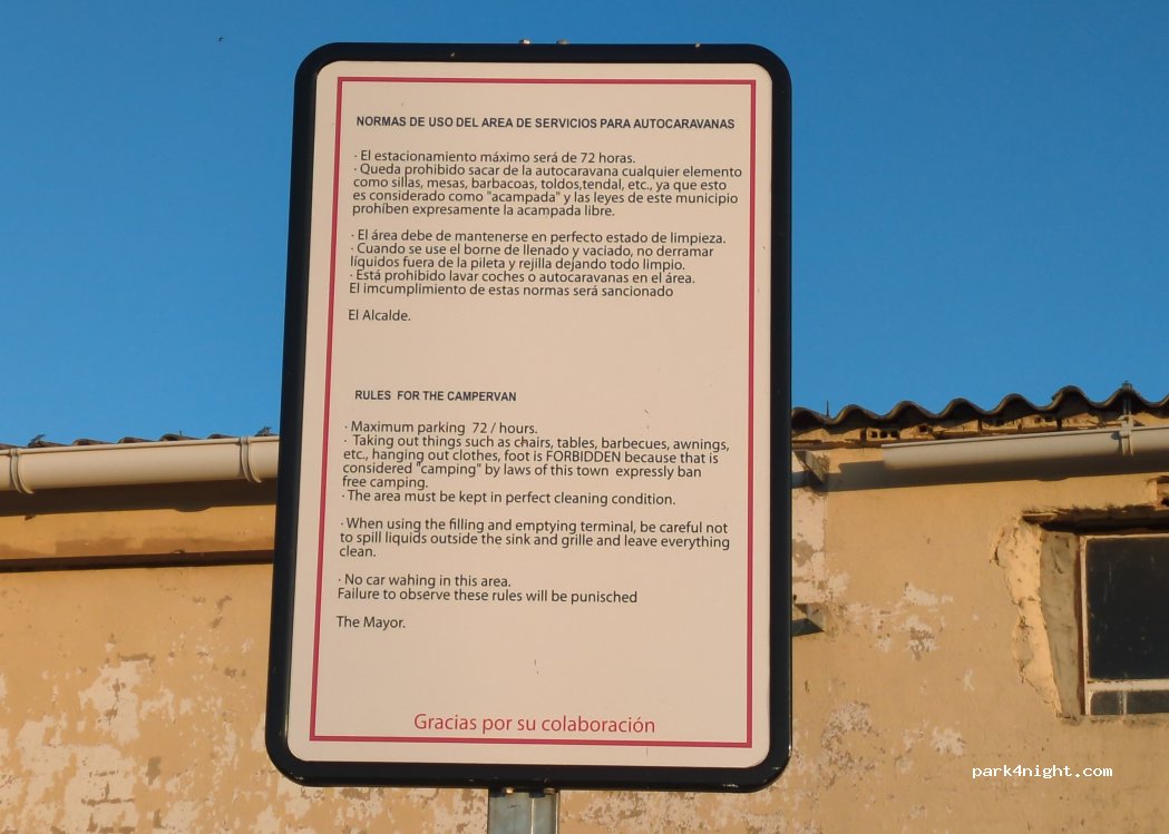 Very quiet place with toilet services, gray water and clean water filling. A town with a lot of atmosphere. Payment services through tokens that must be purchased in various places in town. 1 euro, 15 minutes.