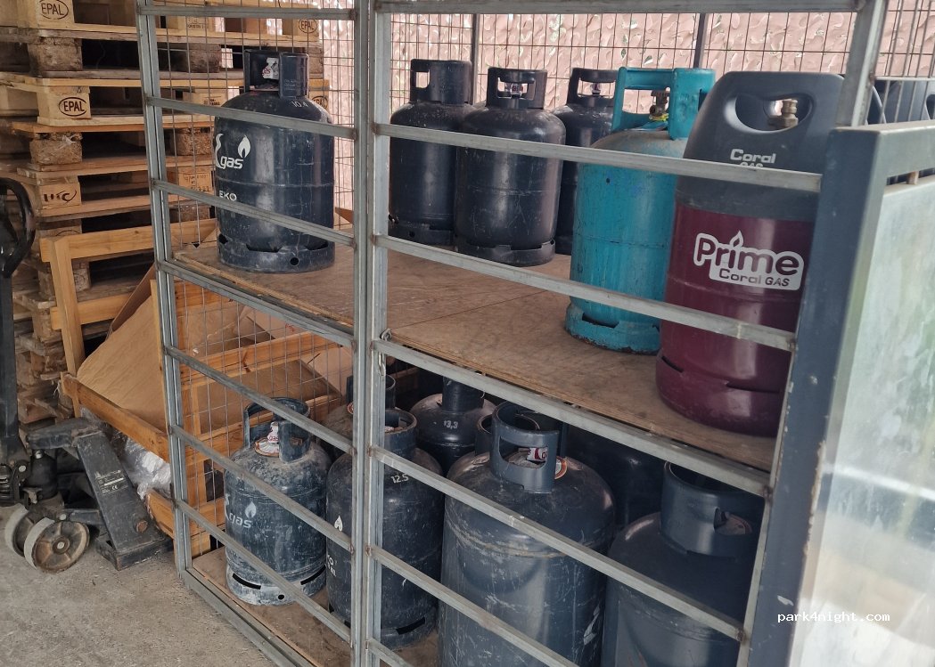 Wasserhahn mit Gewinde für Schläuche am Supermarkt. Auch Gasflaschenservice. Man kann sehr gut auf dem Parkplatz parken und Wasser auffüllen