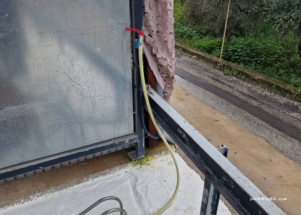 Water tap with thread for hoses at the supermarket. Gas bottle service too. It is very easy to park in the parking lot and fill up with water