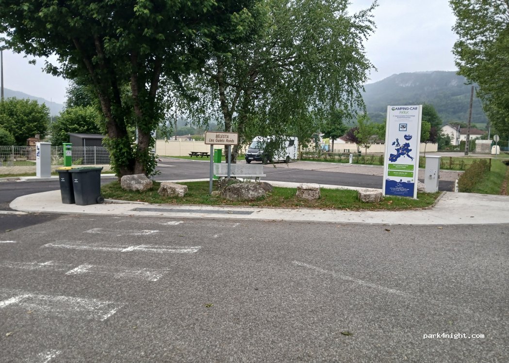 La zona de autocaravanas de pago del Camping-Car-Park de Bélesta está equipada con: tomas de electricidad, 6 parcelas (donde pueden permanecer durante el día y la noche autocaravanas y furgonetas de menos de 9 metros y/o sin remolque) y un punto de recogida de aguas residuales con dos tomas de agua potable.