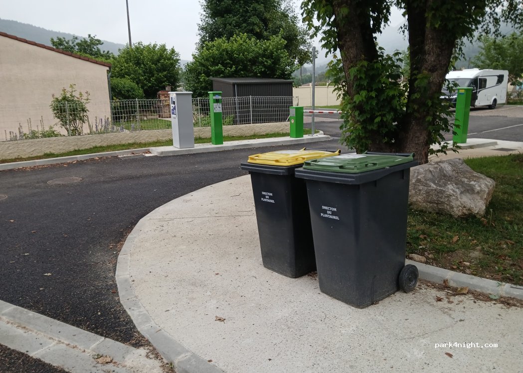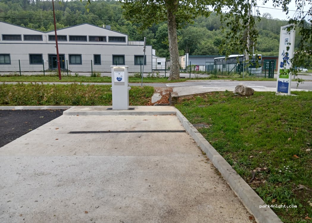 Camping-Car-Park's paid camper area in Bélesta equipped with: electricity hook ups, 6 pitches (where camper and vans shorter than 9 meters or/and without trailers can stay on day and on night) and a waste water dump point with two fresh water hook ups.