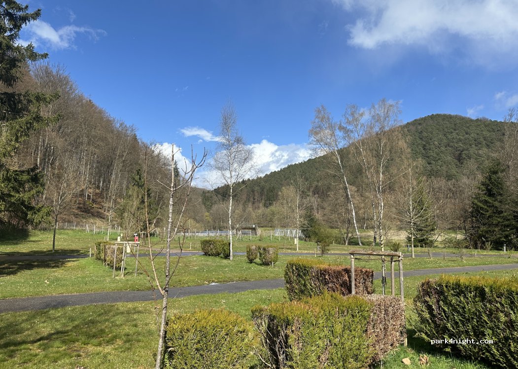 Ein sehr schöner Platz! Wir haben an einem Tag von hier aus vier Burgen erwandert und sind an einem anderen Tag mit dem Rad zum Biosphärenhaus gefahren. Wir hatten Satelliten Empfang. WLAN gibt es an der Rezeption ansonsten kein Telefon-Netz! Der Platz ist unterteilt mit Hecken und Bäumen am Rande gibt es einen schönen Bade-Weiher mit einem einfachen aber guten Pizza- und Flammkuchen- Restaurant.