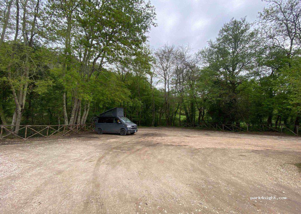 À proximité d’une rivière. Plat, calme, poubelles à proximité. Pas mal de places possibles. Parfait pour la nuit nous étions seules. Parking utilisé en journée car site touristique à proximité.