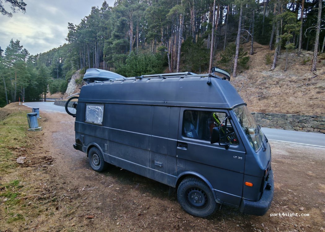 Hay una parada a lo largo de la carretera, espacio para dos furgonetas, tal vez. Hay dos contenedores aquí. Está al lado de la carretera, por lo que habrá ruido, pero probablemente no haya problemas por la noche.