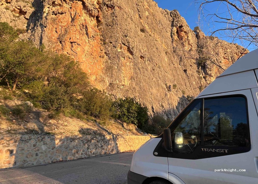 Petit espace au bord d'une route calme pour 5/6 voitures et camionnettes. Idéal pour le rocher d'à côté. Pas pour la nuit car vous êtes déplacé.