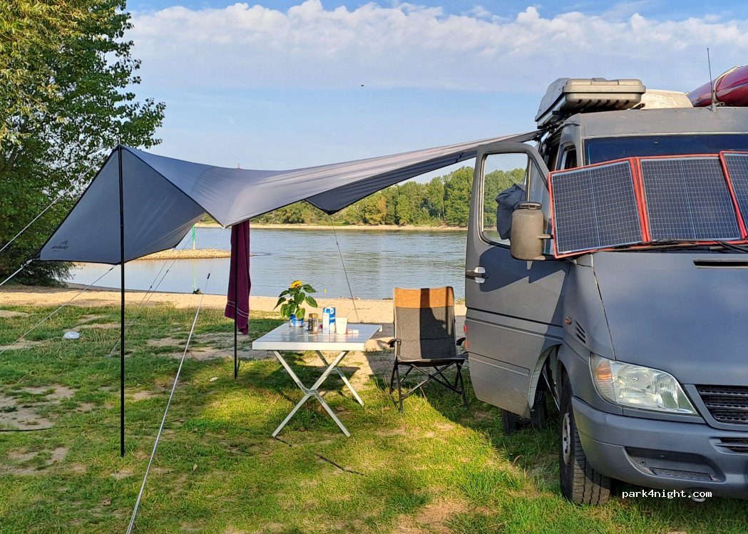 Schön gelegen am Rheinufer. Sanitäranlagen sauber. Dusche kostet für 4 min Euro 1,50. Keine Grauwasserentsorgung da im Schutzgebiet. Kleine Pizzeria am Platz. Freilaufende Hühner und frische Eier.
