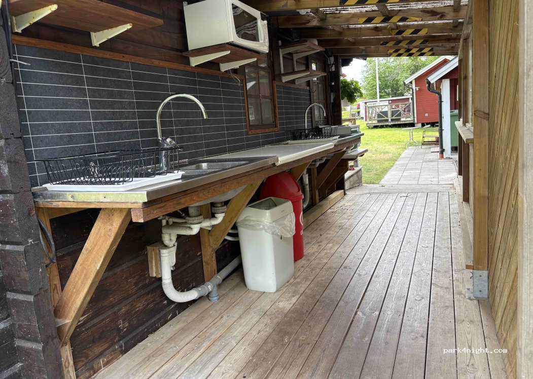 Mooie compacte camping. We werden zeer vriendelijk ontvangen door de eigenaren. Voor 2 nachten 760 Zweedse kronen (camper, bijzet tentje en 3 personen, incl elektriciteit). Alles rolstoel toegankelijk ! Reserveren is aan te raden omdat het meestal goed bezet is. Schoon sanitair (2 toiletten en 3 douches) (schoenen uit) en koken met een magnetron/kookplaat-combinatie buiten maar mooi overdekt.