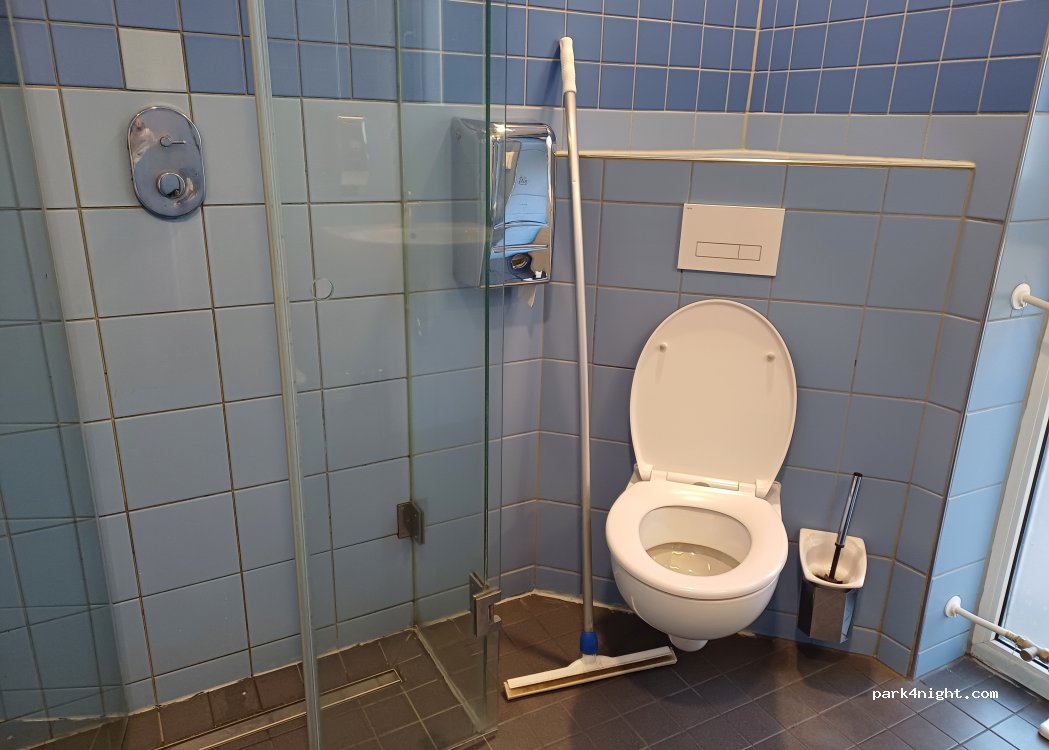 Typical motorway rest area with shower for a fee.