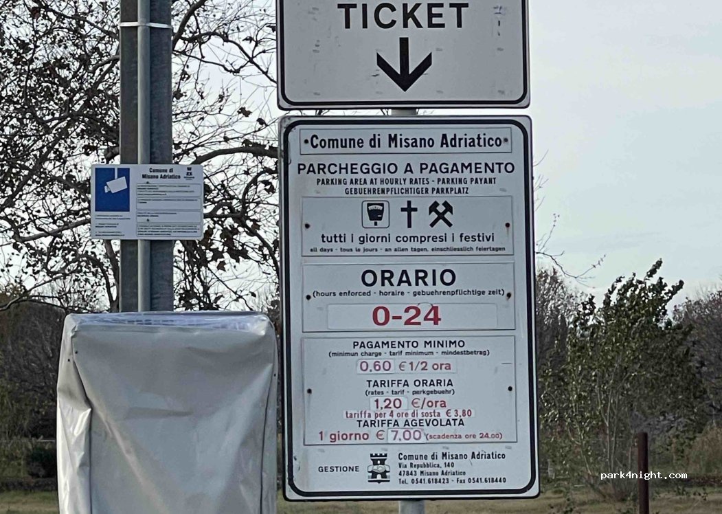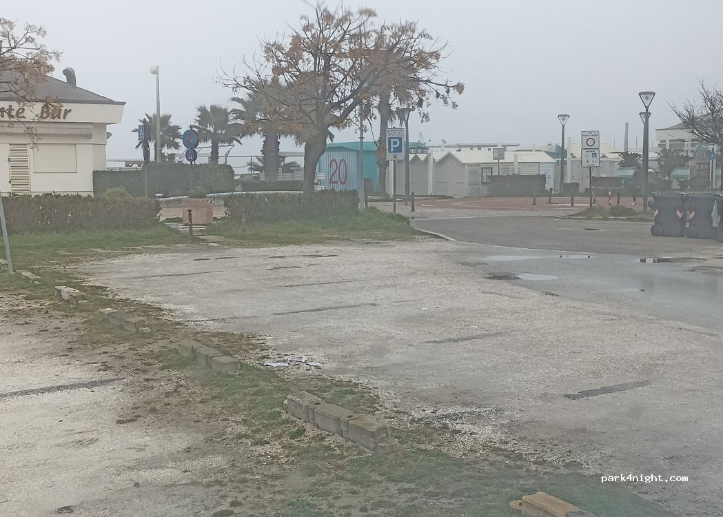 Ampio parcheggio, a pagamento solo da maggio a settembre. Zona verde e tranquilla di fronte al mare. Solo parcheggio diurno. No campeggio.