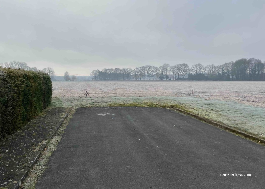 Great parking space at the end of a dead end street in a residential area; suitable for a smaller vehicle. Right next to the field with a great view and absolutely quiet. No trash cans or anything similar available, but great walking paths nearby.