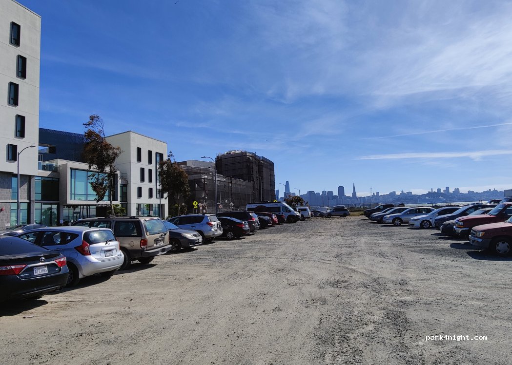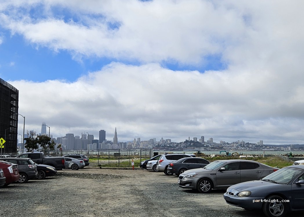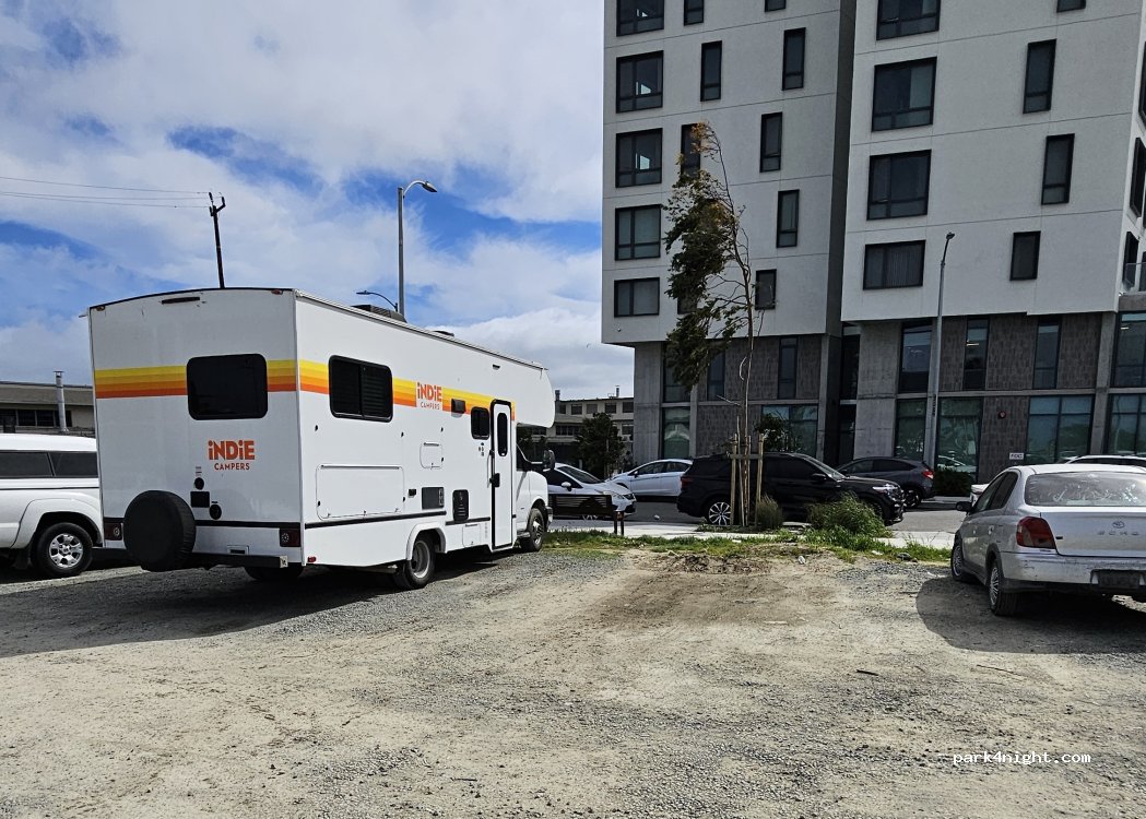 The parking lot is used by local residents. Small trucks also park here at night. There are no signs that allow or prohibit parking. Unfortunately, crime is an issue on Treasure Island. We parked here for 3 days without any problems and felt safe. The hotel opposite is monitored by cameras. 20 meters from the parking lot is a bus stop with connections to San Francisco.