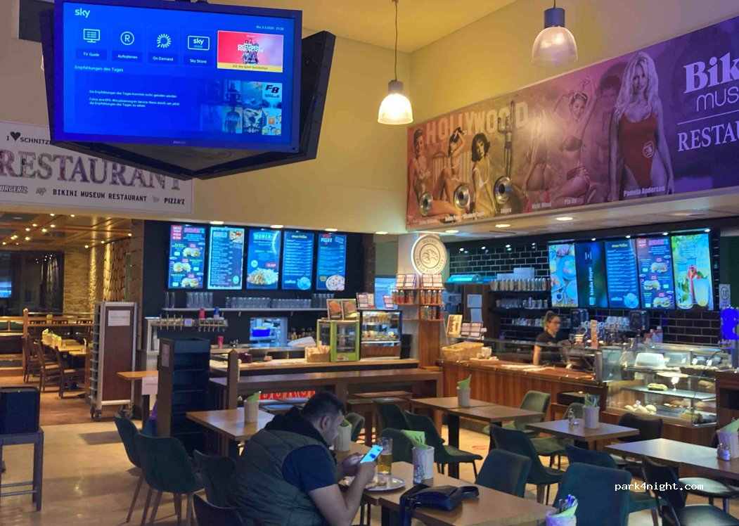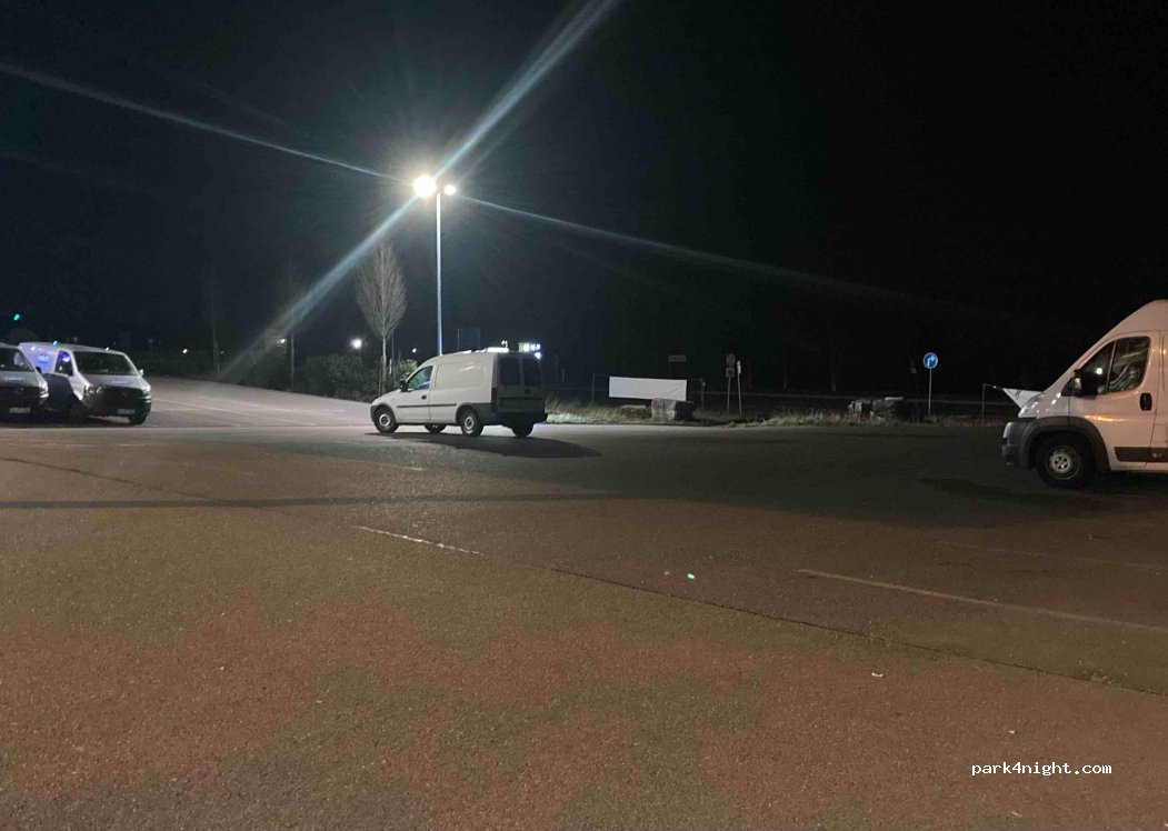 Gas station and rest area…at the motorway exit. Showers and toilets are chargeable and very clean…Open 24/7…Restaurant and bar in the station. Parking lots lit all night. Rest area for heavy goods vehicles too…relatively quiet…good for spending a night in transit…