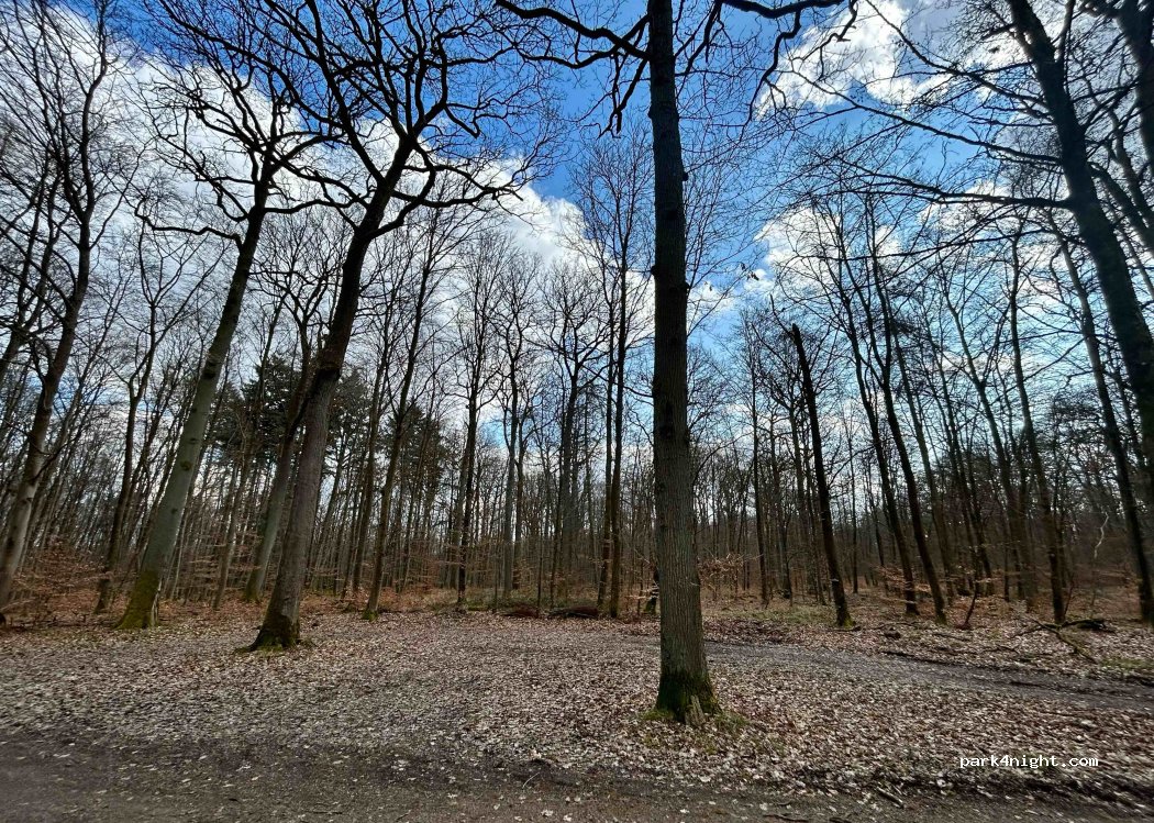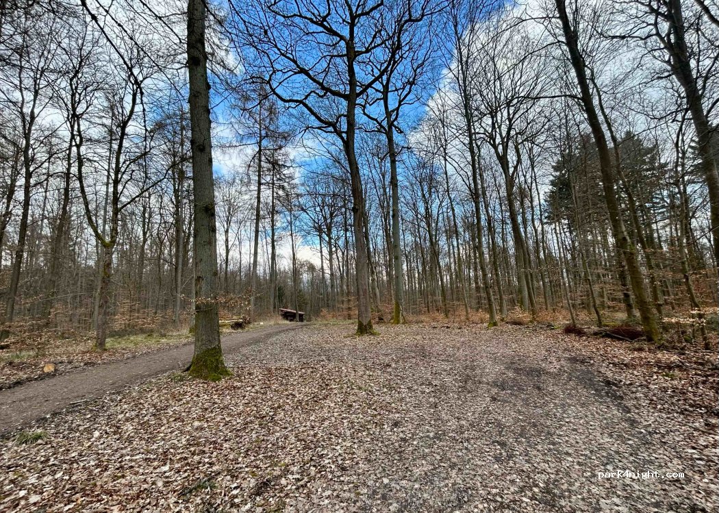 A small clearing along a forest path without any amenities. There's no official parking lot next to the quiet main road. Good for one night. Used by dog walkers and locals. There's room for two small, self-contained vans between the two large trees.