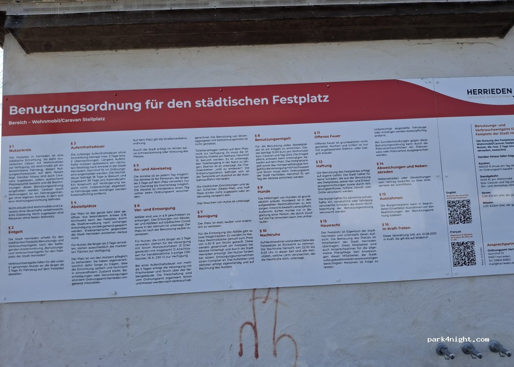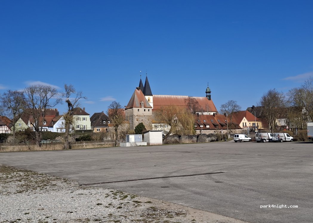 Plaza de aparcamiento para autocaravanas en el recinto ferial municipal, directamente en el Altmühl. La superficie ligeramente inclinada está en parte asfaltada y en parte con grava. En la zona verde adyacente hay tres pilares con cuatro zócalos cada uno. El pago y la selección del socket se realiza en la columna central. No existe autosuficiencia de agua dulce. El casco histórico con sus murallas, su colegiata y su Frauenkirche se encuentra a poca distancia. Los primeros tres días o dos noches son gratis. Posteriormente se cobrará una tarifa de 10€ por día/noche que deberá abonarse previamente en la oficina de orden público.