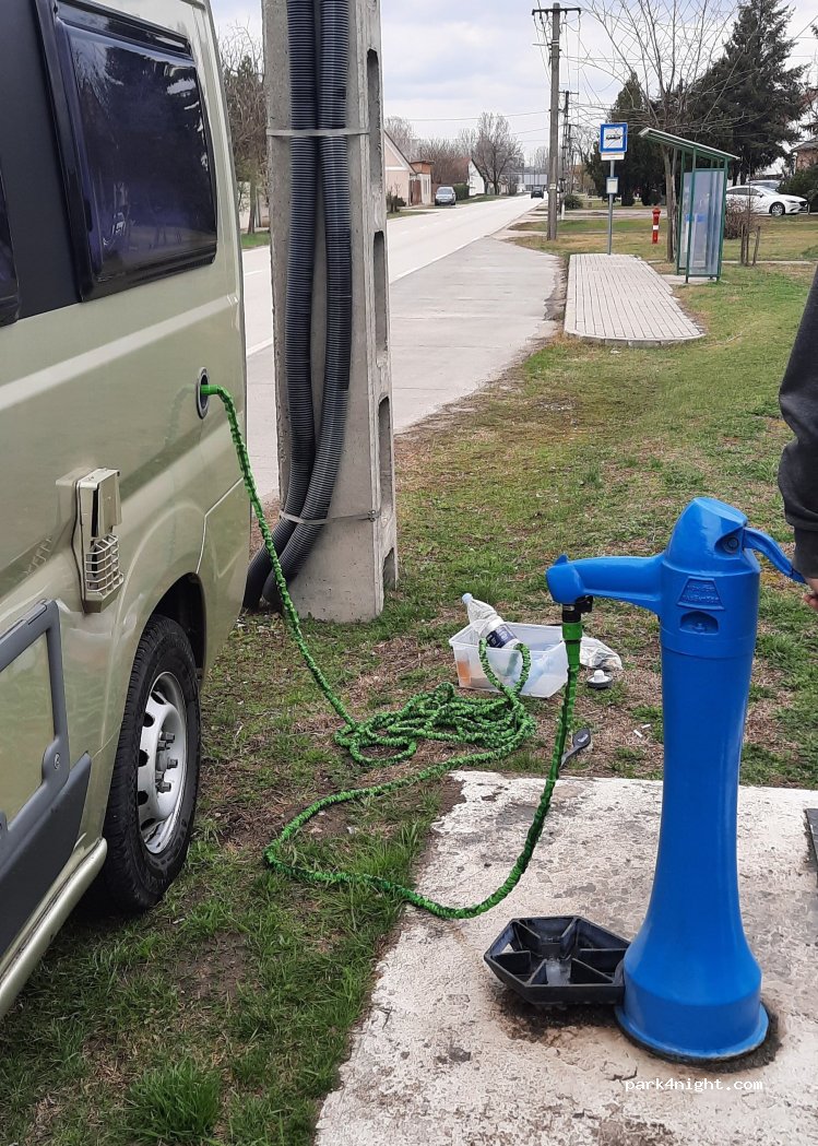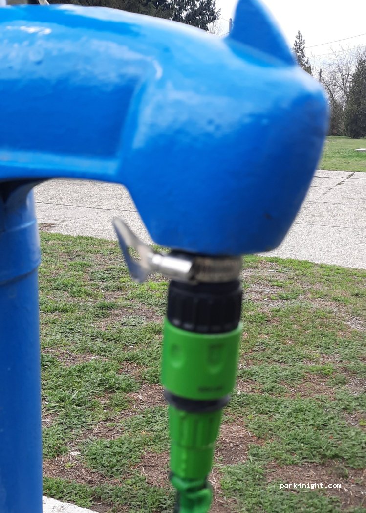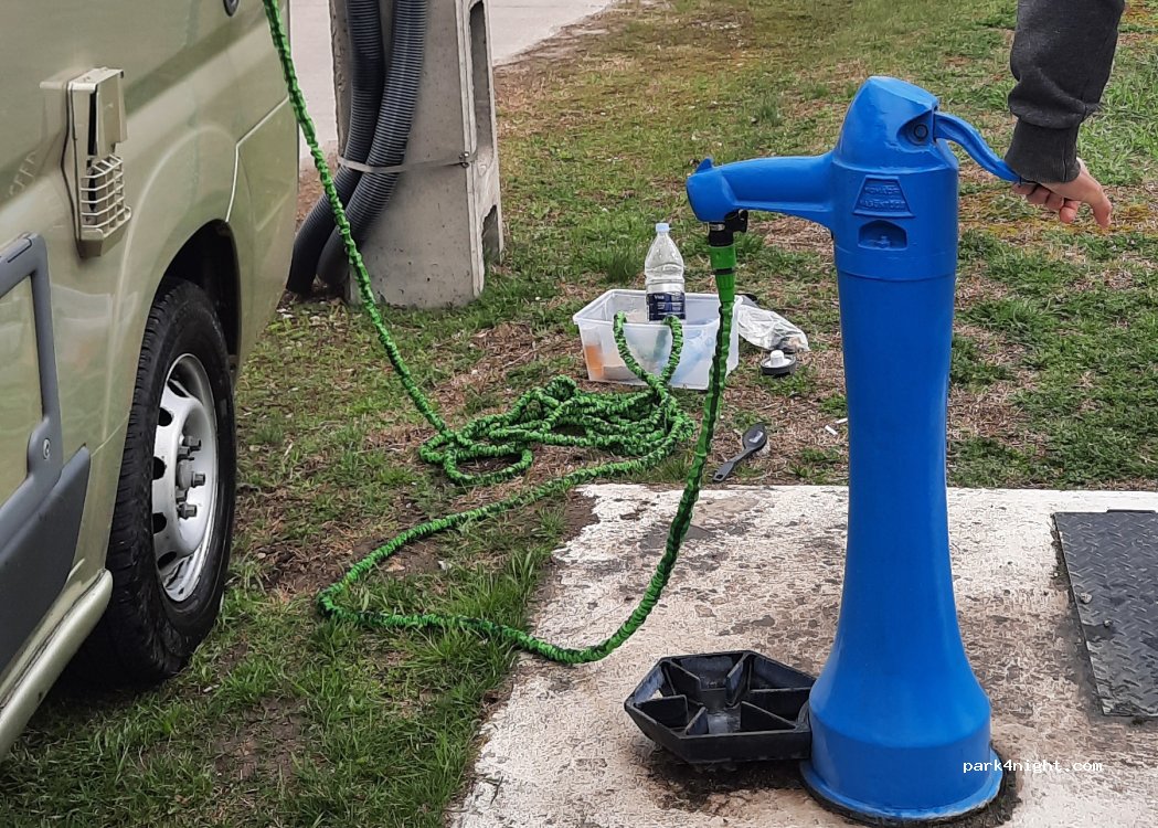 Blaue Zapfsäule am Straßenrand, aber Parken daneben möglich. Zum Anschluss von 1 Rohr benötigen Sie 1 Adapter. Ansonsten Dosen