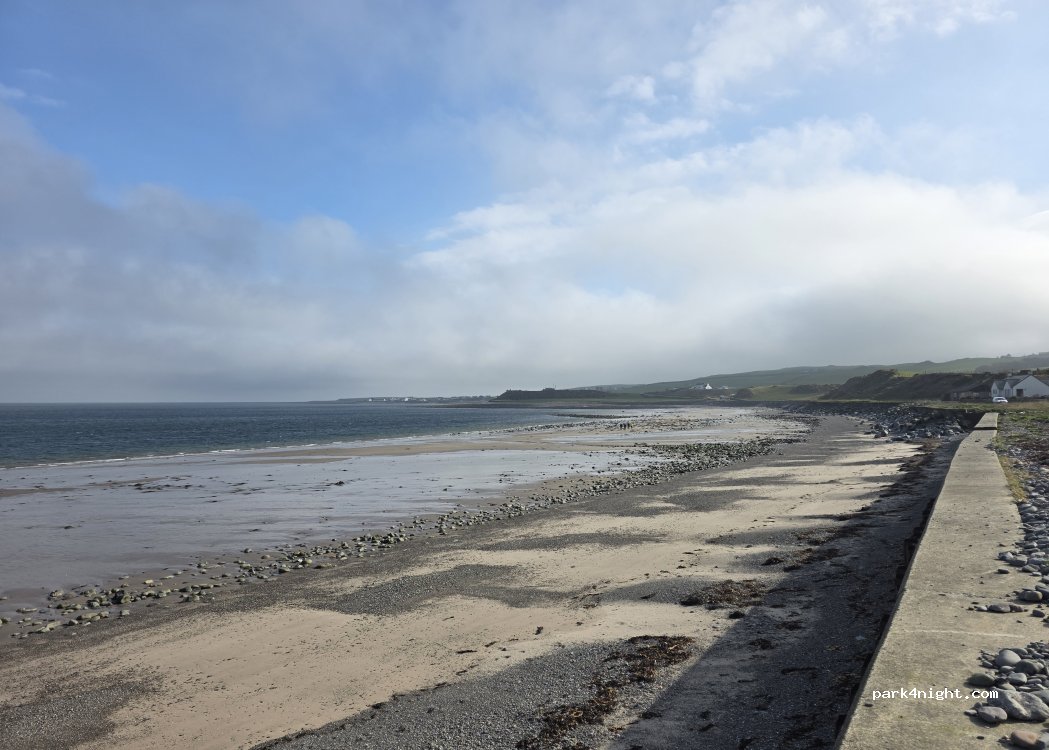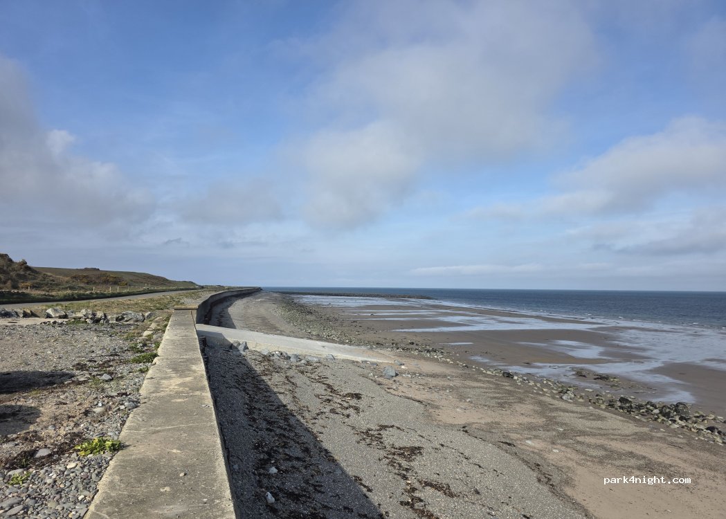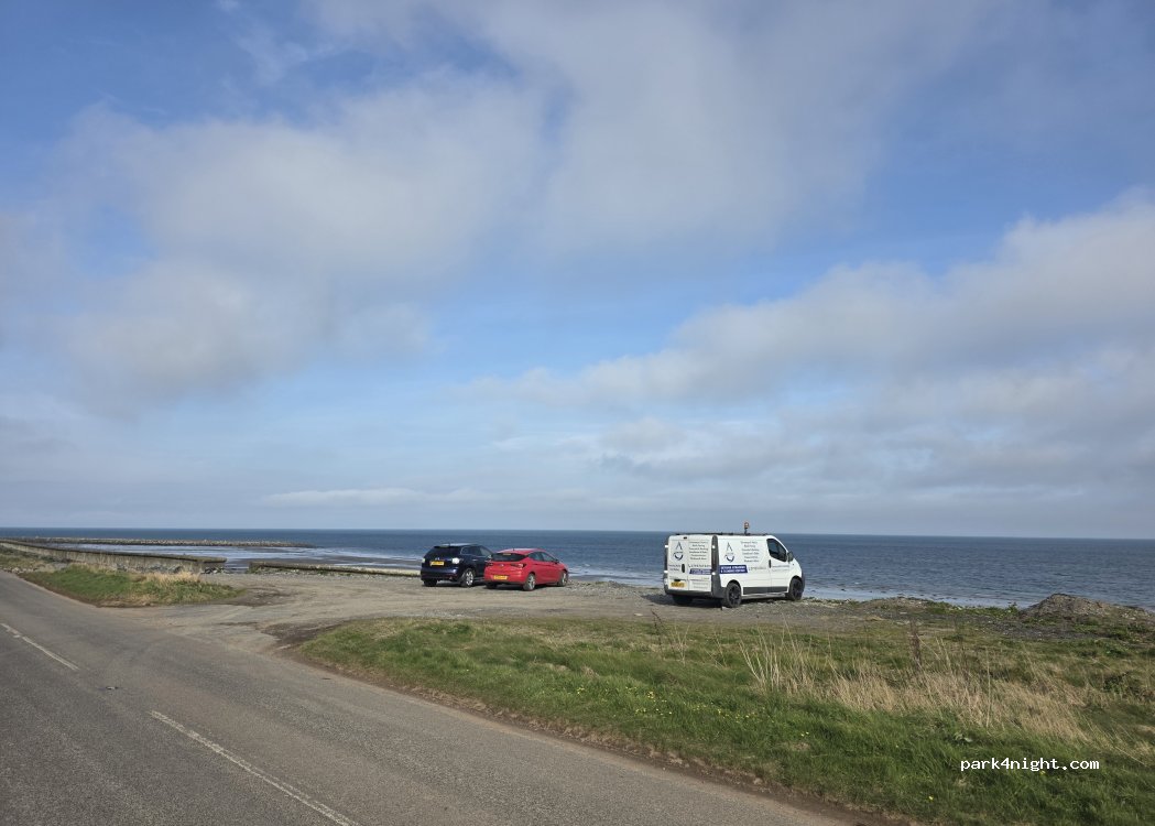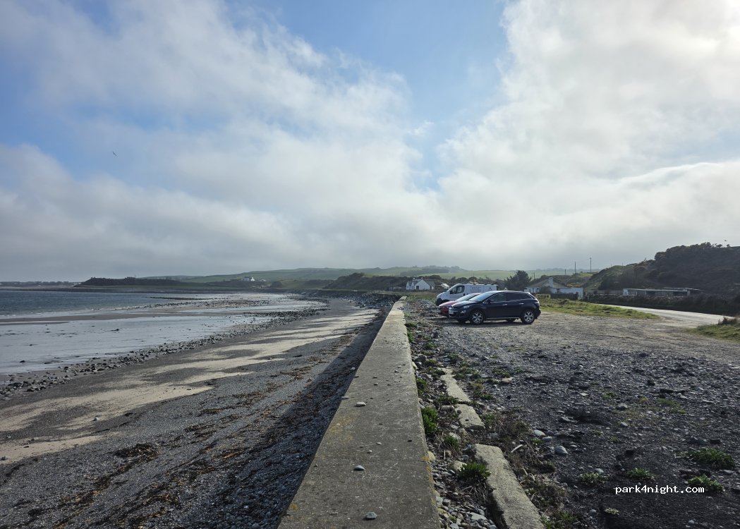 Parking area close to sea wall and beach . hard standing (some potholes) with enough space for 5/10 vans/motor homes. small boat ramp (may require access) so keep it clear of obstruction . plenty of space other side of car park