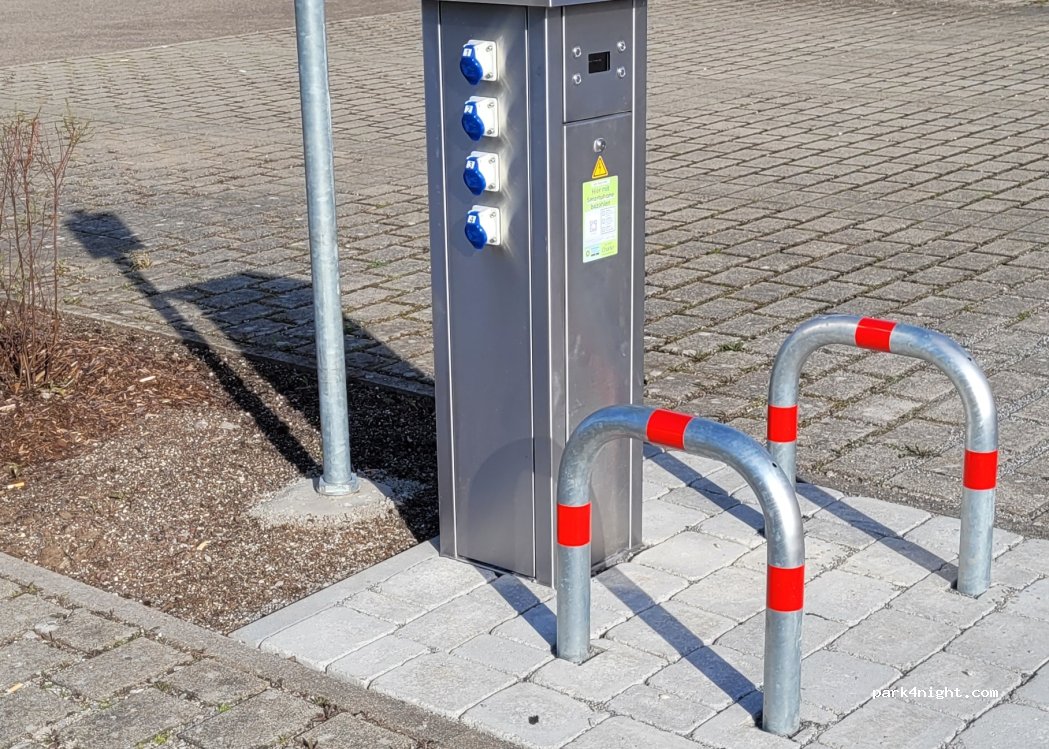 La municipalité a créé ici un très bel espace de stationnement, qui se trouve sur un parking pavé des salles de sport et communautaires adjacentes. Le terrain est légèrement en pente mais il n'est pas forcément nécessaire de conduire sur des cales. Les 8 connexions d'alimentation sont situées sur deux colonnes.