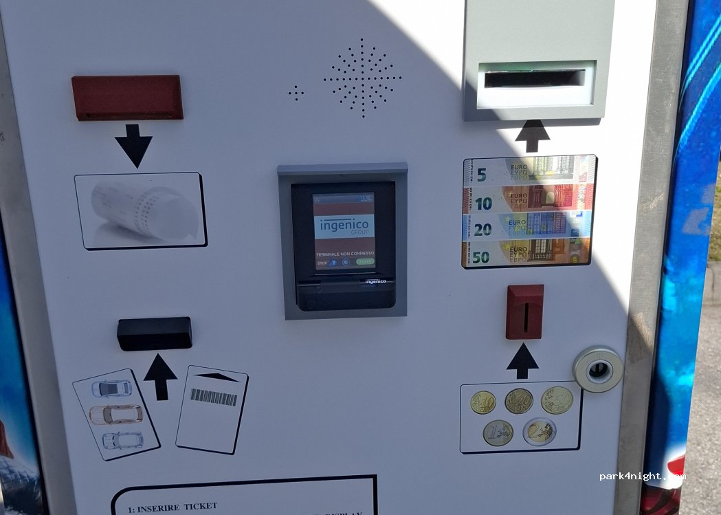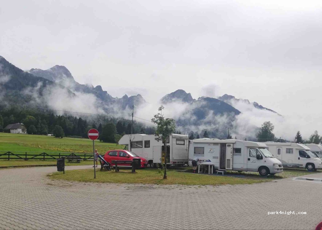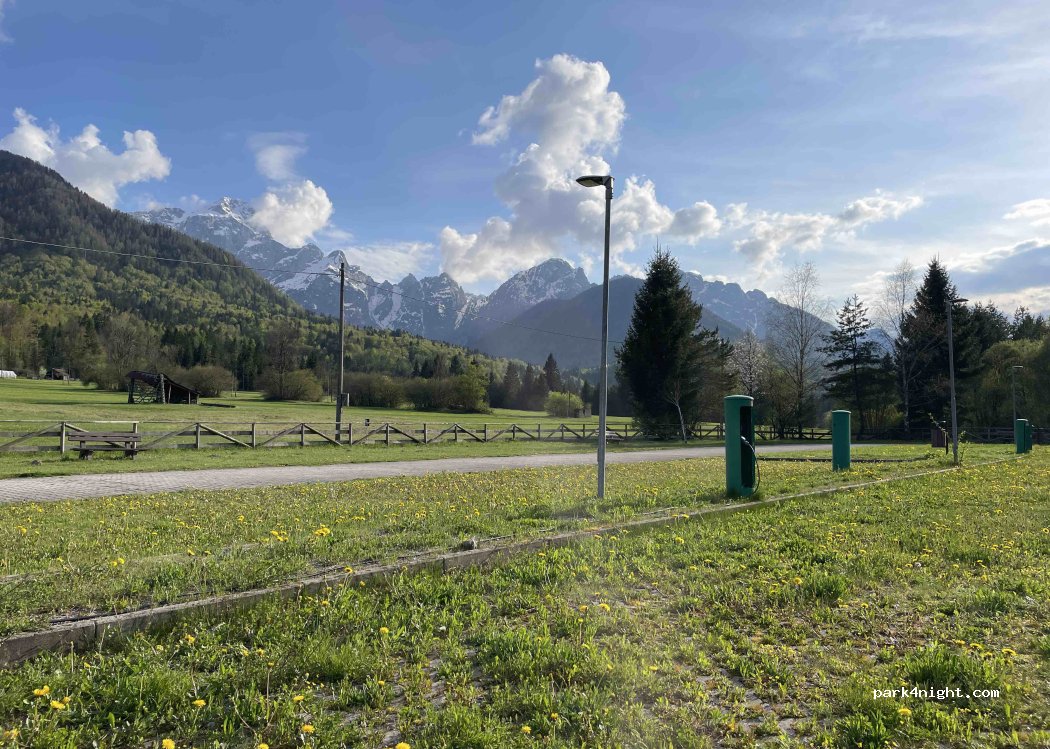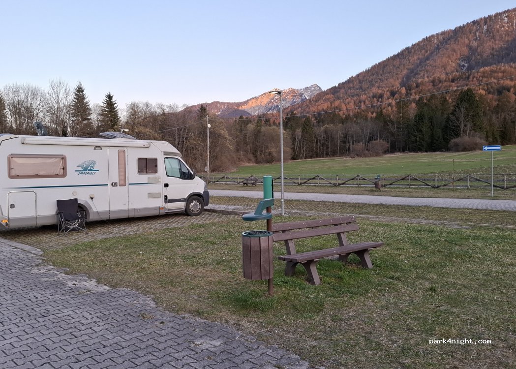 Parking is working in automatic mode. Costs 20€ per night There are fresh water, black and grey drain. There are no toilets and showers. Place is very nice, mountains are all around. The bike path “Alpe Adria” is very close. PS. Don't get out of the car when paying! The barrier is closing too fast!