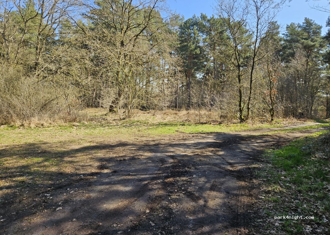Intersection de chemin forestier avec espace pour camping-car. Aucun panneau d'interdiction à la jonction avec la prochaine route principale.