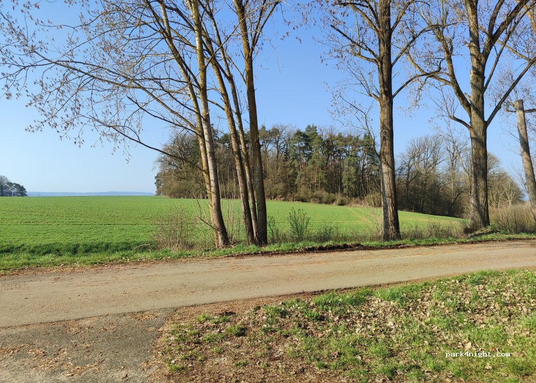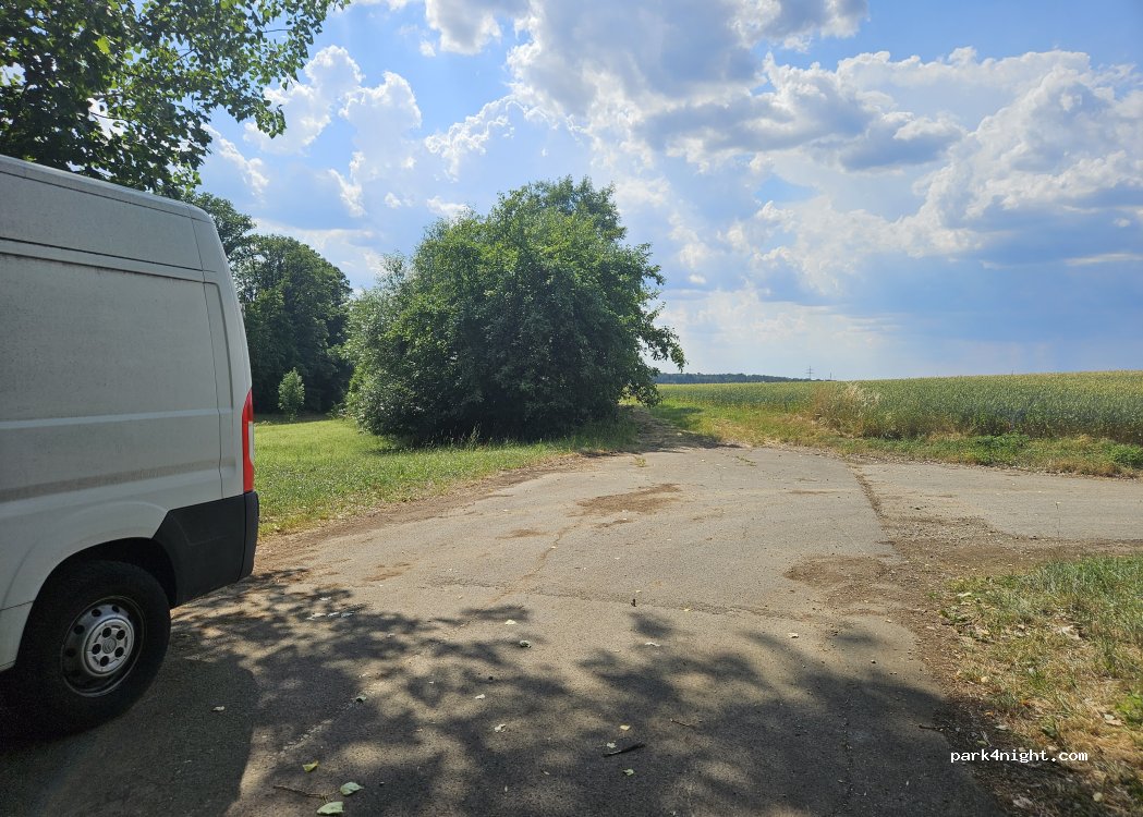 Kleine Wendebucht an wenig befahrener Straße, Schatten und Sichtschutz durch Bäume. Sehr schöner Blick über die Felder. Standen Dienstag auf Mittwoch allein. Super ruhig, fast gar kein Straßenverkehr.