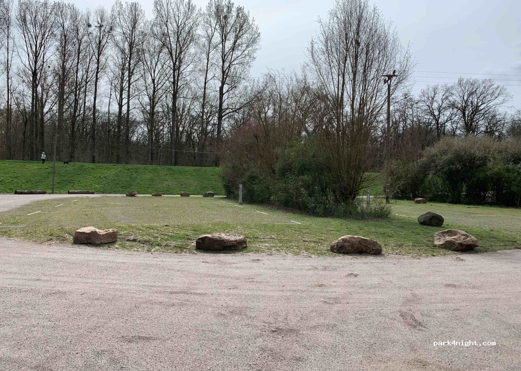 Sehr der Natur überlassen. alte Stellflächen/wilde Parkplätze sind wohl abgesperrt. Der Rest für WoMo noch da. ca. 4-5 Plätze. Zufahrt etwas schwierig für große Mobile zwischen Sträuchern umd Dammhang. Etwas Müll und extrem viele Mücken. Null Aussicht auf irgendwas. Einfach nur hinterm Deich stehen. Sind ein paar Meter weiter an den Rhein.