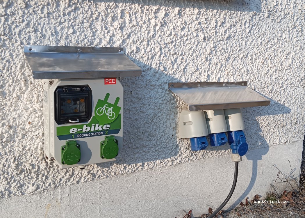 Des branchements électriques sont disponibles sur la zone gravillonnée pour deux à trois camping-cars.
