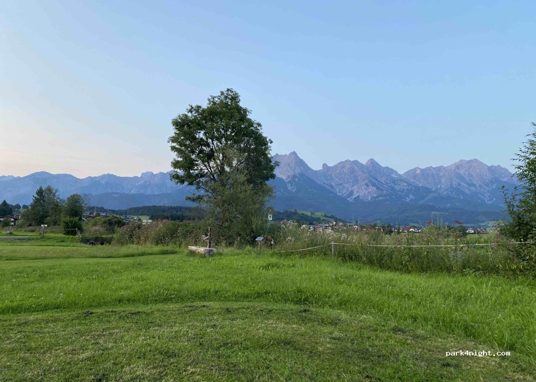 Wunderschön gelegen am Bach mit herrlichem Blick auf das Steinerne Meer. Wer Ruhe sucht, sollte wissen, dass regelmäßig Regional-, Fern- und Güterzüge vorbeifahren. Abends waren die Stellplätze komplett belegt – insgesamt 14 Camper, darunter auch Zelte – wodurch es etwas enger wurde als auf den Fotos. Es gibt keine Ausstattung vor Ort, daher empfanden wir die 25 € pro Nacht als eher hoch.