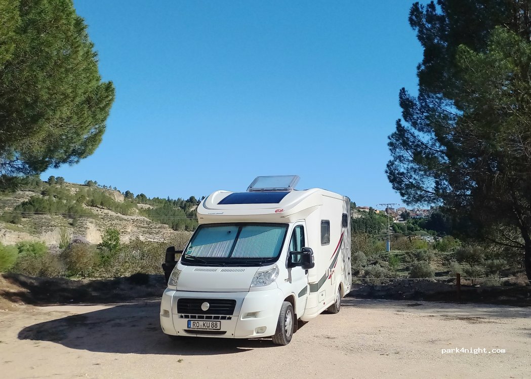 Schöner Platz auf zwei Ebenen. Von der oberen aus hat man einen Blick auf die Stadt, hört aber mehr von der Straße. Der Stellplatz ist nicht von der CM-3218 aus erreichbar, wie in Adresse und Koordinaten angegeben, sondern von der Rückseite über einen Abzweig von der AB-200 aus. Zufahrt hier: 39.146166, -1.678005.