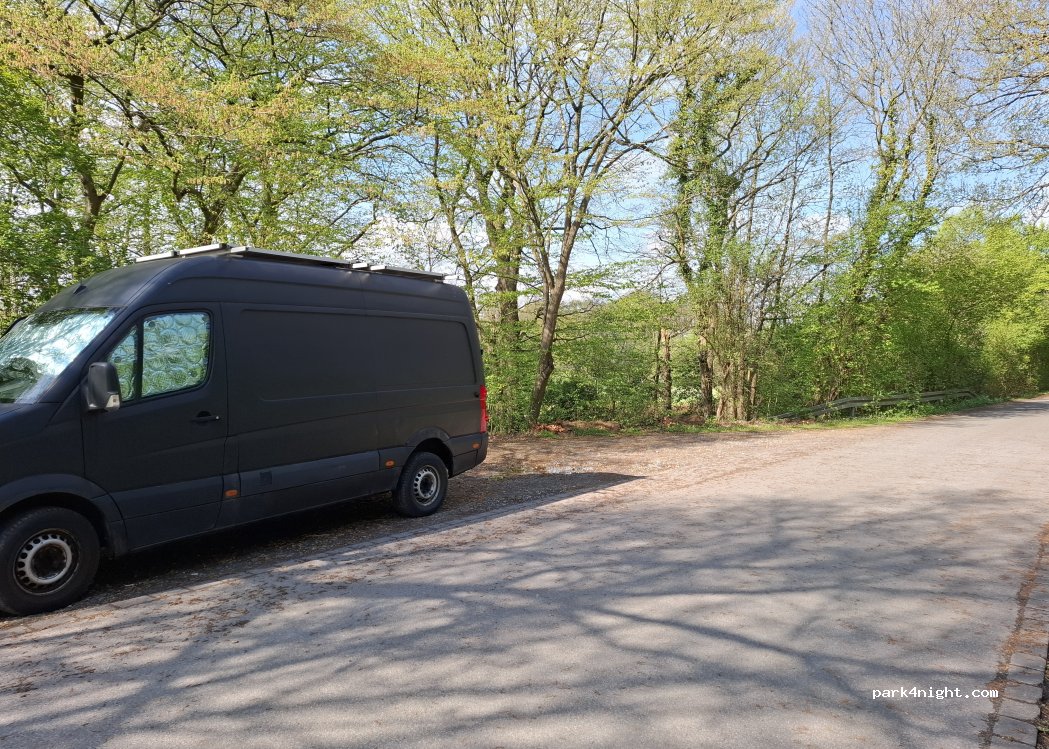 Parkbucht mit Mülleimer an einer Sackgasse. Ruhig gelegen mit entfernt hörbaren Autoverkehr. Ebene Fläche.