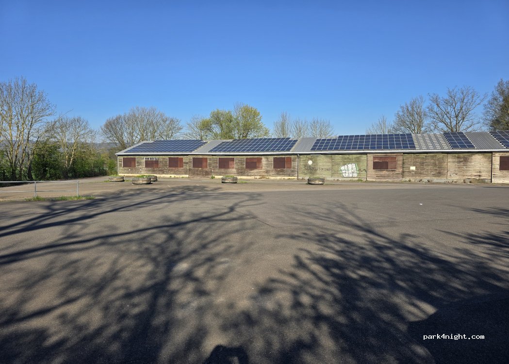 Stor asfalteret plads bag banegården. Rolig og udmærket til en overnatning. Ingen faciliteter så affald tages med.