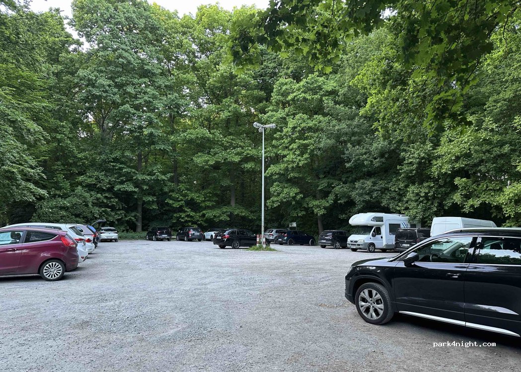 Habe hier eine Nacht gestanden: Es ist nicht "mitten im Wald", aber am Wald. Die kleine Kreuzung, an der der Parkplatz liegt, ist über Tag recht befahren, aber ab 2200h war's dann ruhig. Der Parkplatz wird von Besuchern des Restaurants gegenüber genutzt, statt Hirsch und Co. gibt's Hunde und Spaziergänger. Für eine Nacht war's gut.