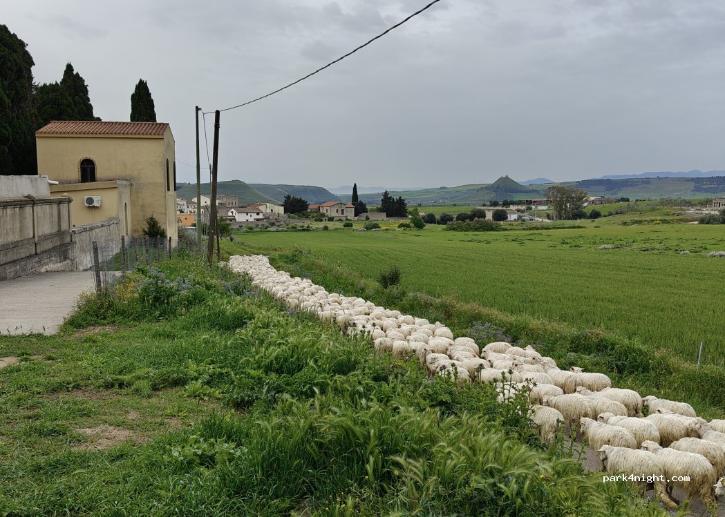 Behind the cemetery, a quiet little corner for a car/van, no traffic on the road and open views of the countryside around Barumini