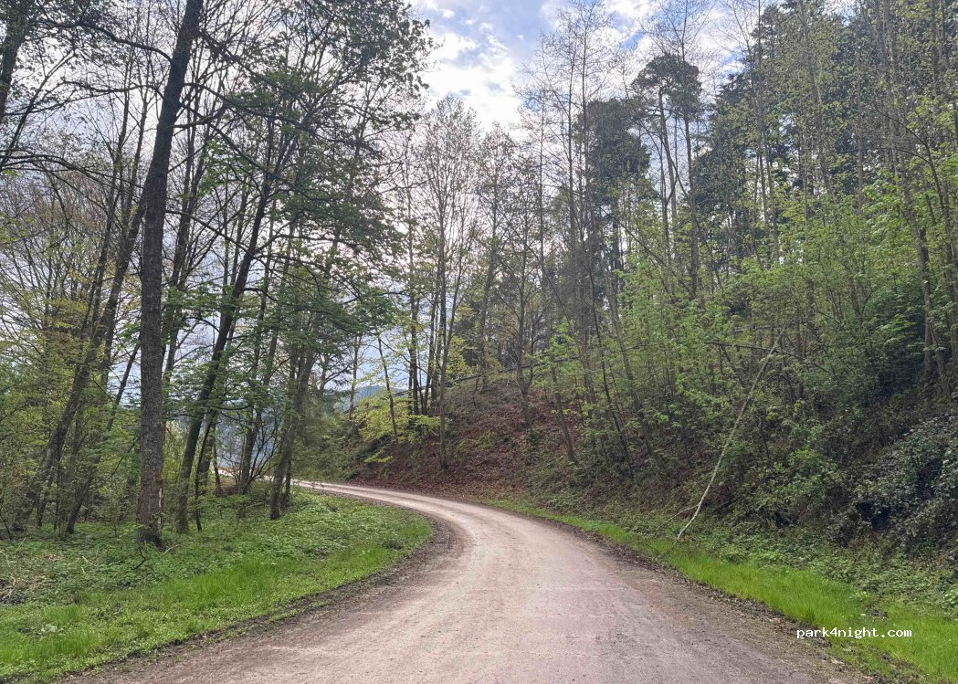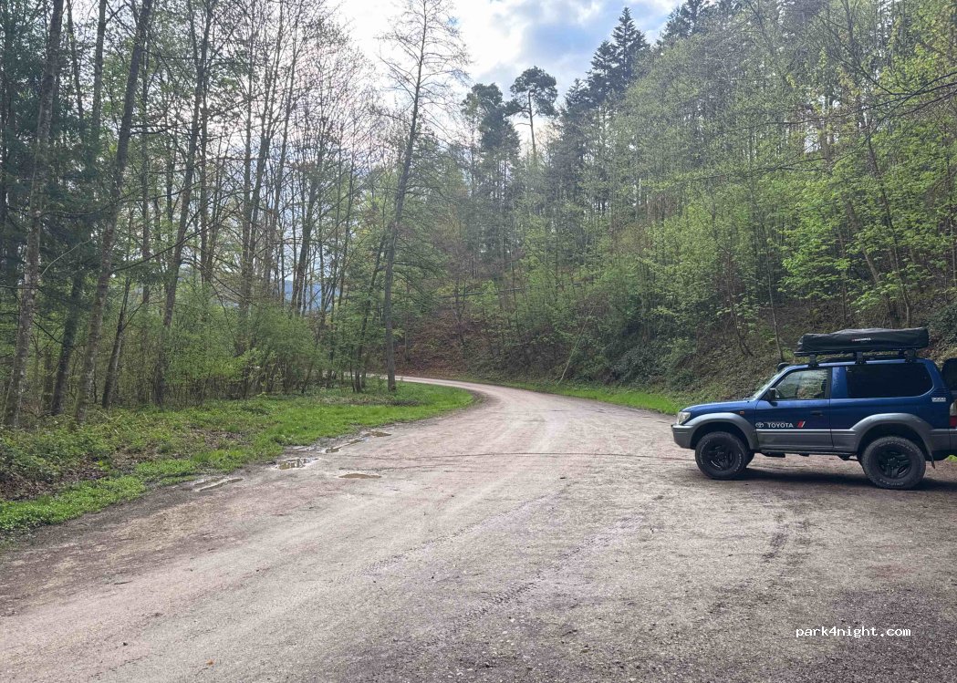 Sieht aus wie ein alter Forstweg mit einem Parkplatz 200 m von der Straße entfernt. Die Zufahrt ist mit dem Wohnmobil etwas schwierig, aber ich bin sicher, dass man unten problemlos wenden und hineinfahren kann. Wir blieben eine Nacht, und oben auf der Straße fuhren nur wenige Autos vorbei; man konnte sie leicht hören. 50 m weiter unten auf der unbefestigten Straße gibt es einen Trinkwasserbrunnen.