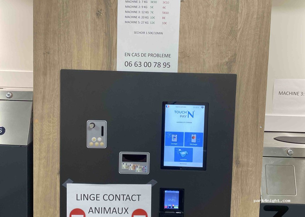 Laverie automatique. Ouvert tous les jours de 7h à 21h et -20 % le jeudi. Paiement espèces ou CB.